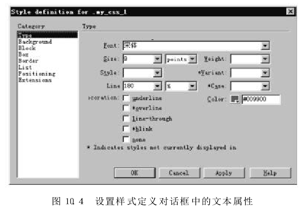 在弹出的"StyleDefinition(样式定义)”对话框的"Category"列表框中,选择"-Type"项,出现"Type"设置面板,设置my-css-1样式的各种属性,如图10.4所示。