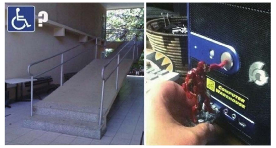 图1-6是2幅网络上流传的照片,左图的通道是为了残障人士而设计的吗?看样子好像是,又好像不是,让人匪夷所思。右图是钢铁侠造型的U盘,外观很酷是不是?但是使用的时候好像出了点问题。钢铁侠的手紧紧地按住了关机键,且手臂不能自由活动。