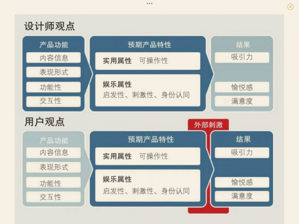 实用性特征和产品的实际应用与功能相关;娱乐性则与用户的健康心态有关。理解这两者间的区别有利于我们理解如何参照UX来设计产品,而正是这种区分解释了为什么UX本身无法被设计。