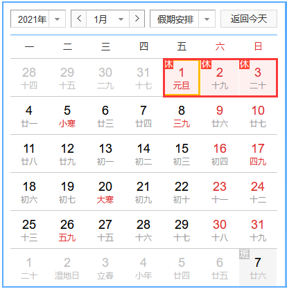 放假时间:2021年01月01日(周五)——2021年01月03日(周日),共3天。