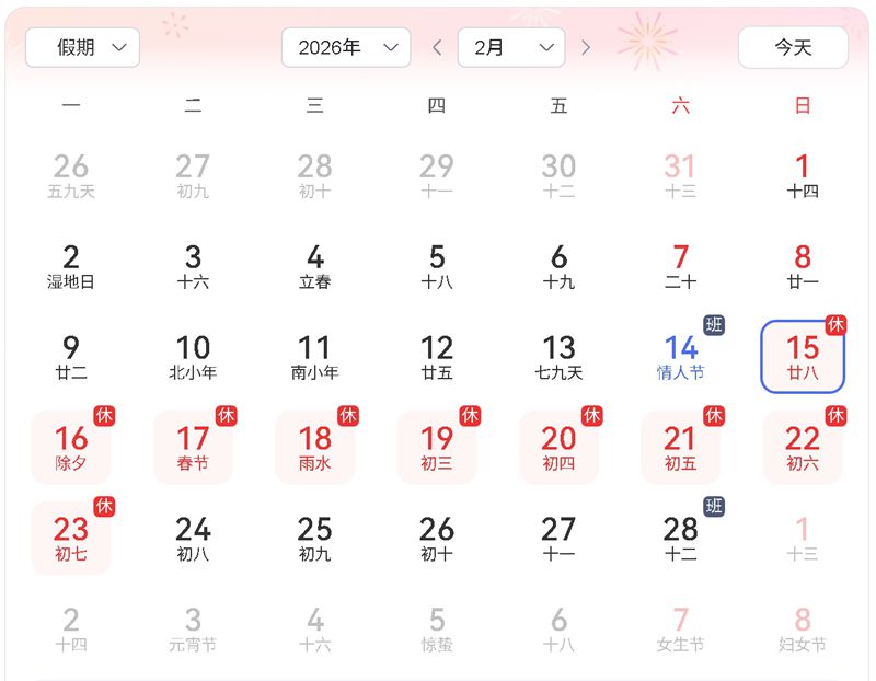 放假时间:2026年2月15日(周日)——2026年2月23日(周一),共九天。